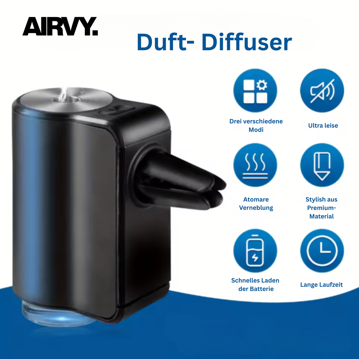 Der Airvy Diffuser ist nicht einfach ein weiterer Lufterfrischer – er ist ein intelligentes Duftsystem, das dein Auto spürbar aufwertet. Dank smarter Vernebelungstechnologie verteilt er Duftpartikel besonders fein und gleichmässig. Keine künstliche Chemiewolke, sondern ein natürlicher, sauberer Duft, der den ganzen Innenraum angenehm erfüllt. Modern, stylisch und hocheffizient – Airvy setzt neue Massstäbe, wie ein Auto heute riechen sollte.